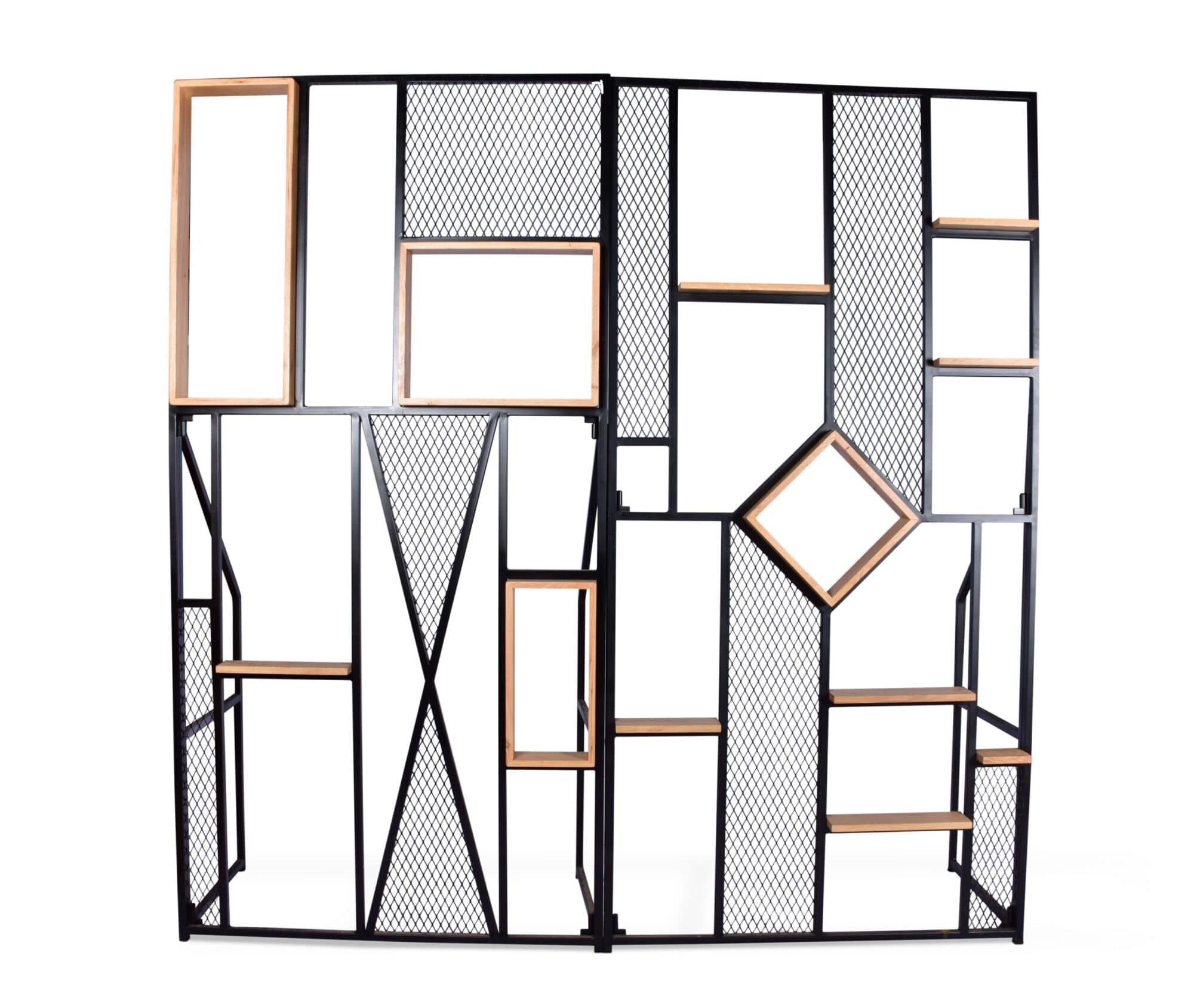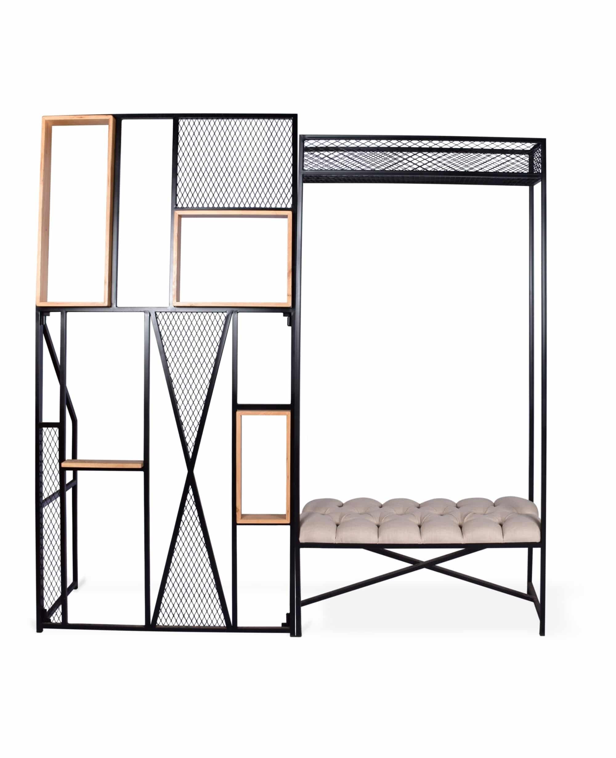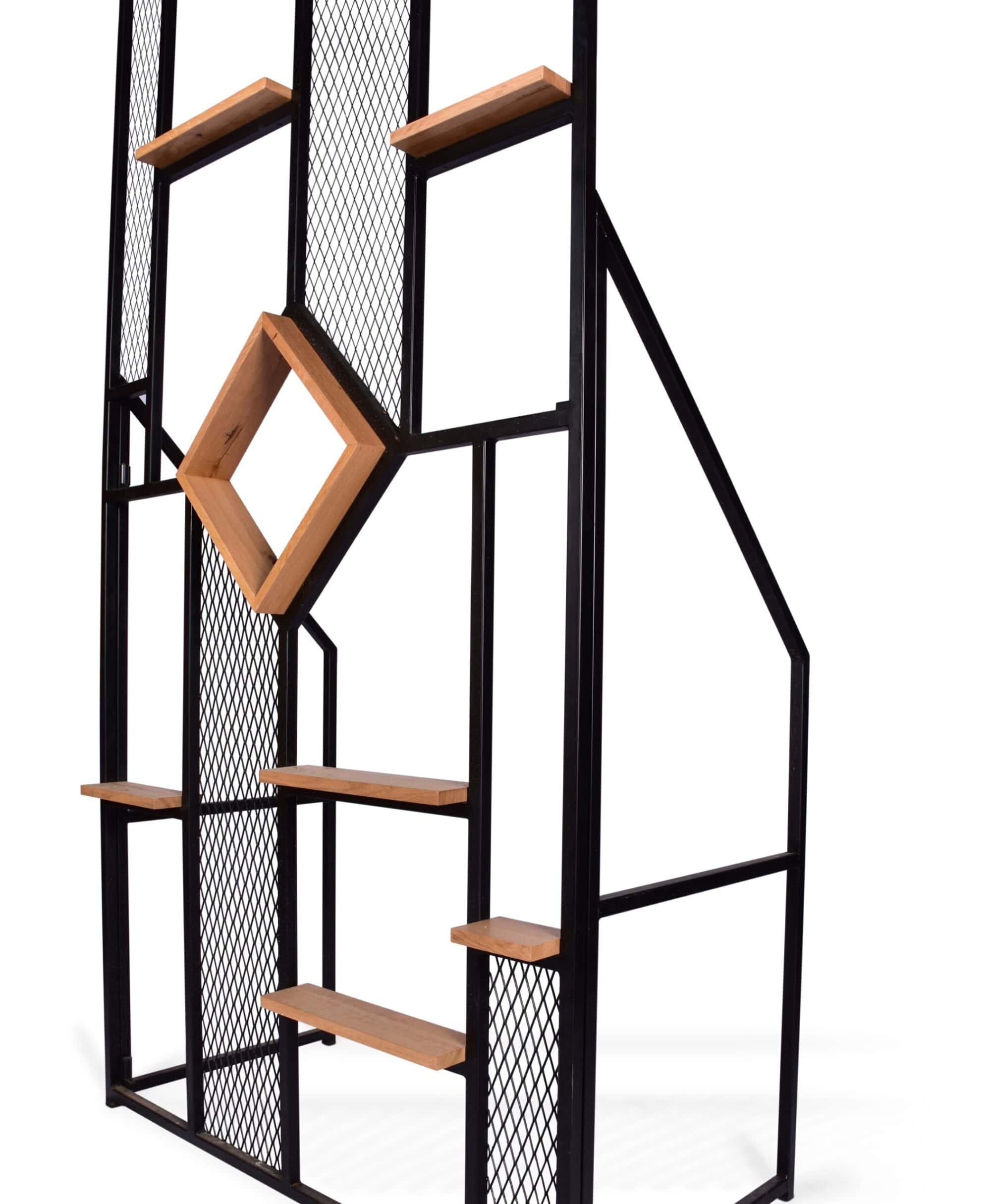 קיר עץ וברזל דקורטיבי המשלב מדפוני עץ צרים פירזול רשת וברזל שחור – אידיאלי בתור מחיצה ותחימת חללים
