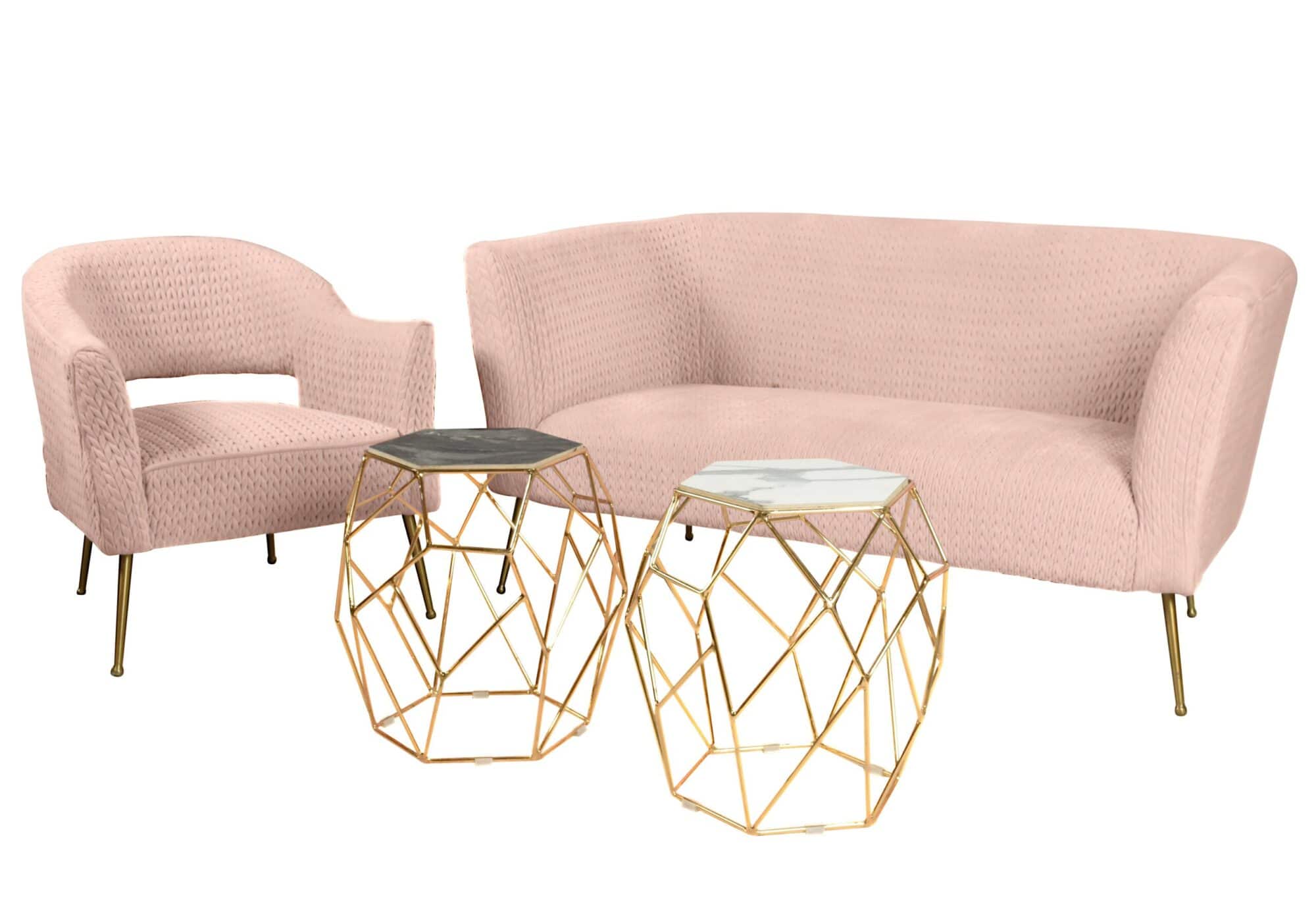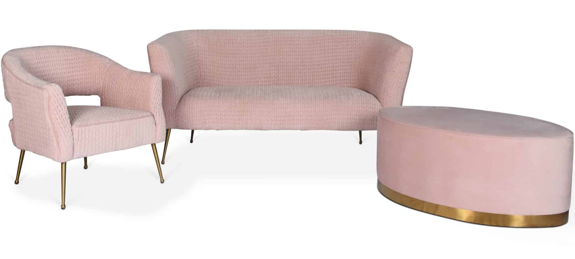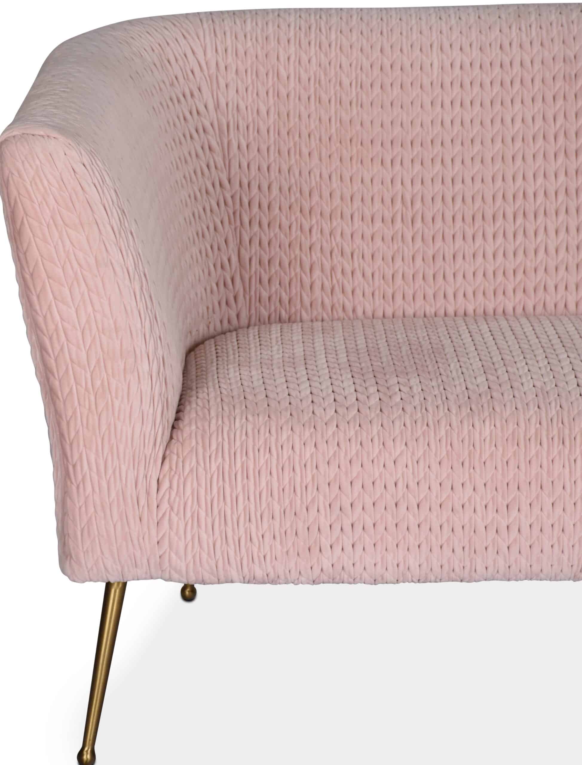 ספה קטיפה מעלפת בגוון ורוד בייבי עם רגלי מתכת מוזהבות