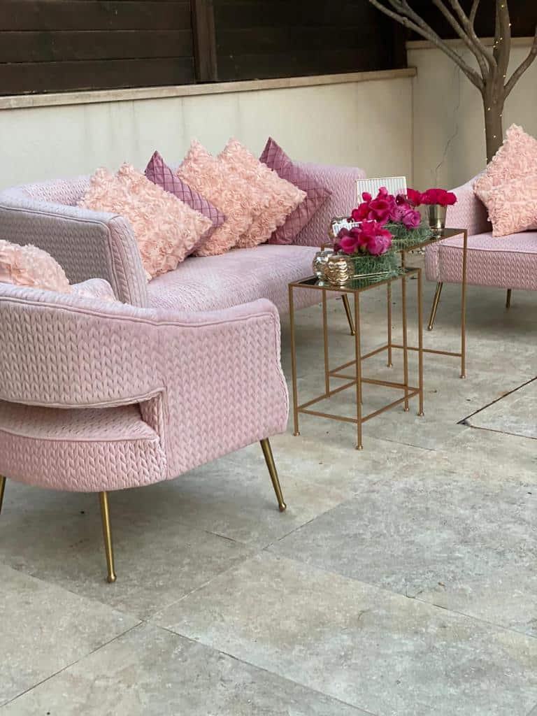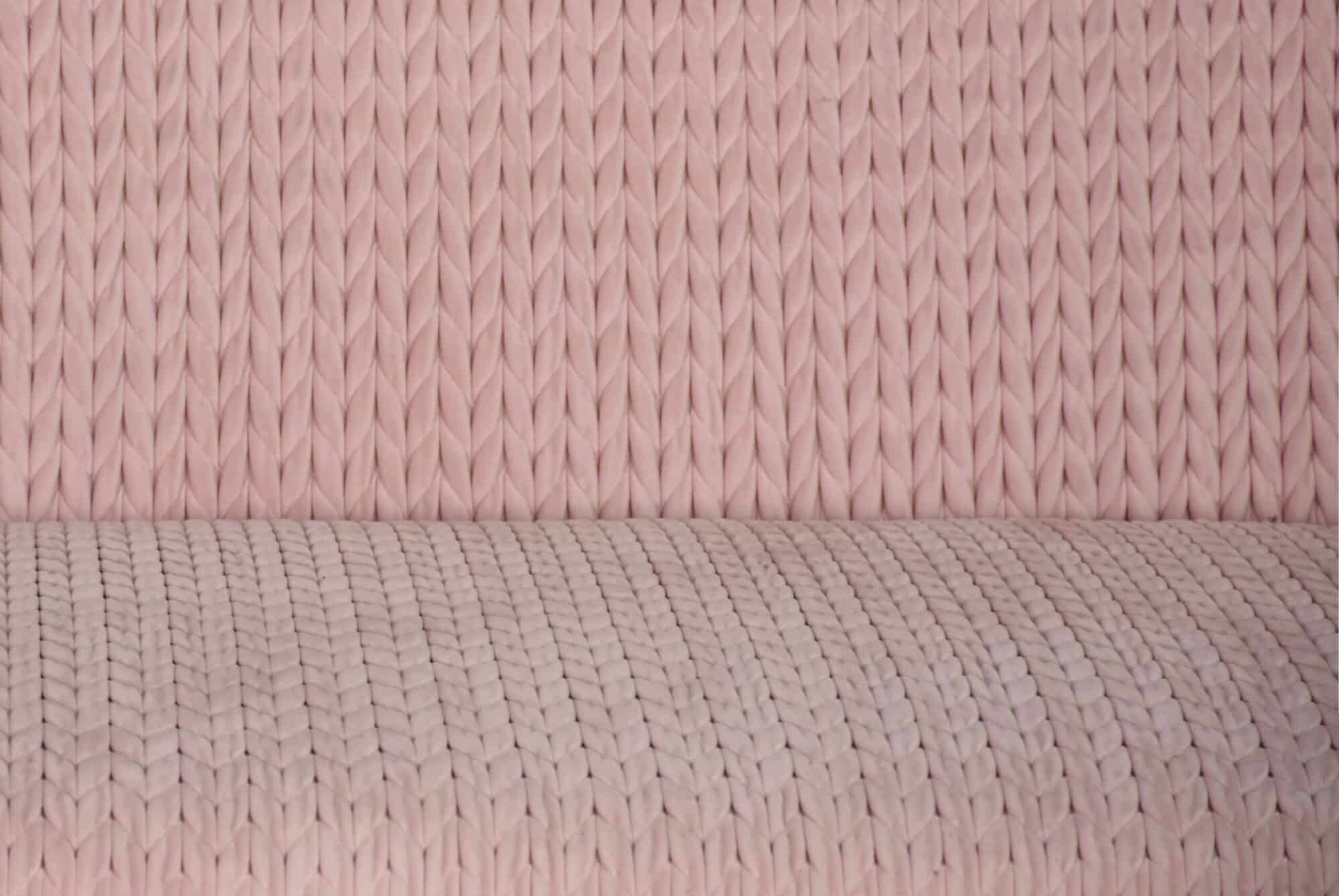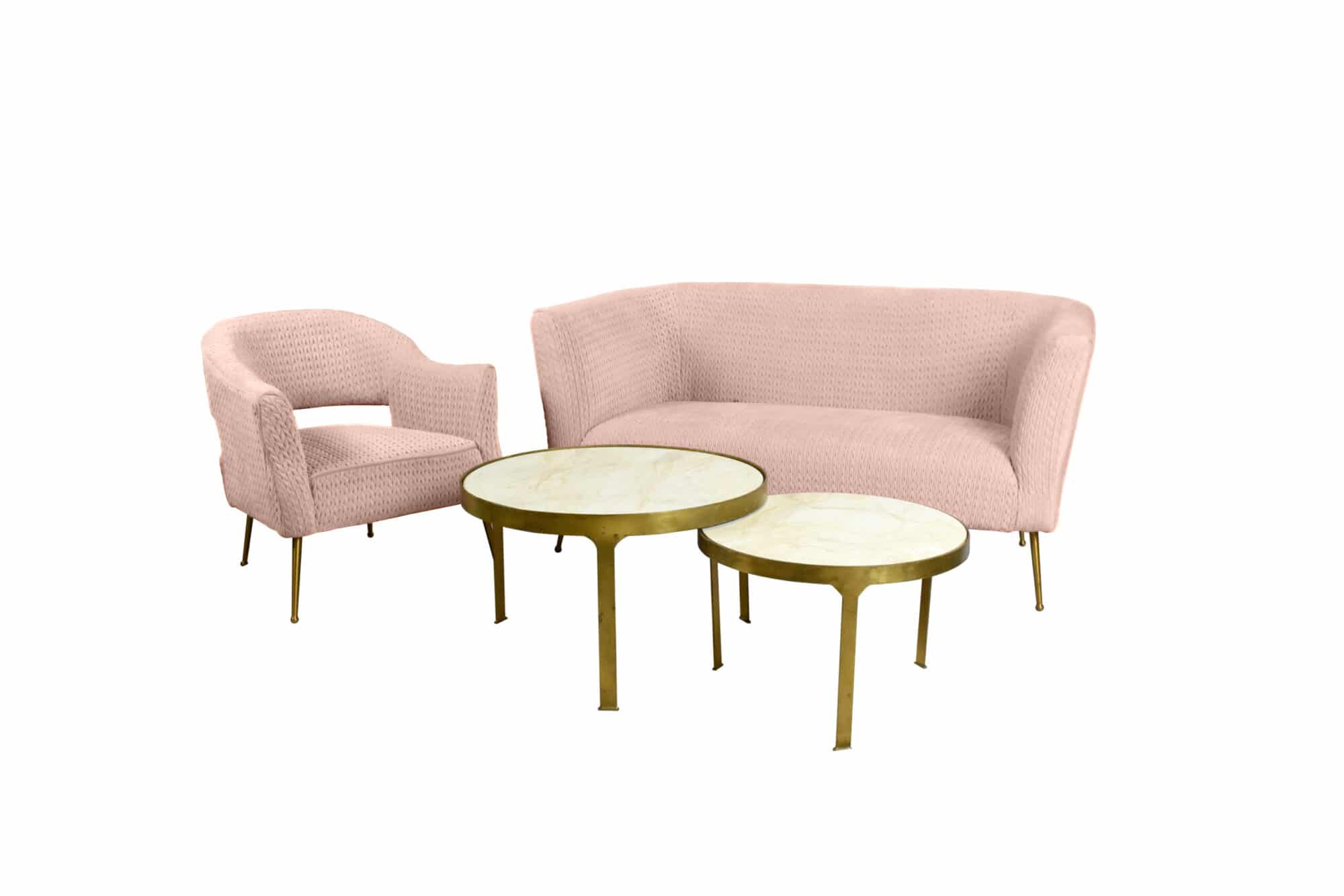 ספה קטיפה מעלפת בגוון ורוד בייבי עם רגלי מתכת מוזהבות